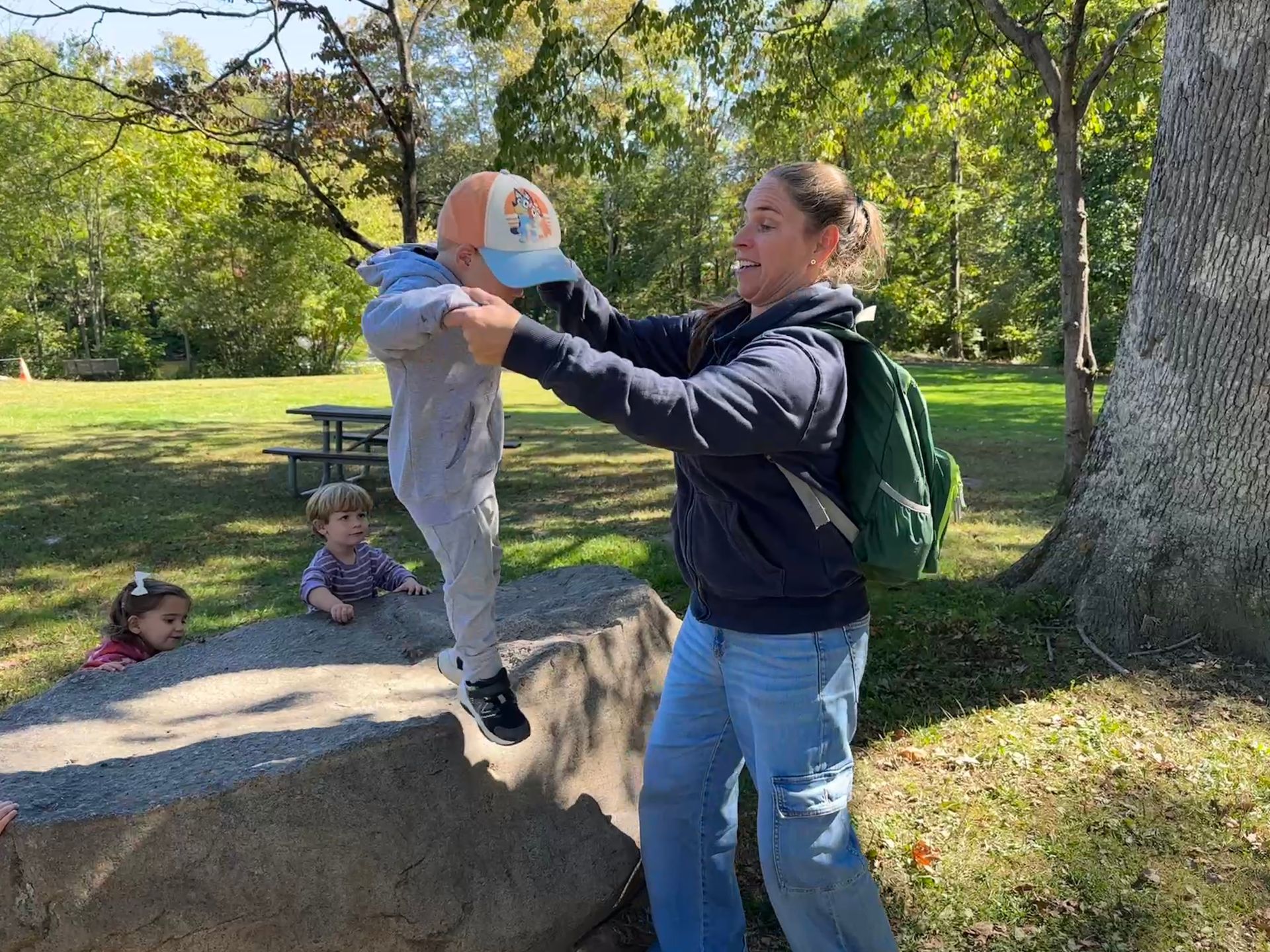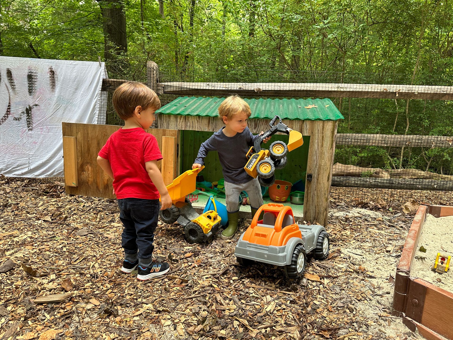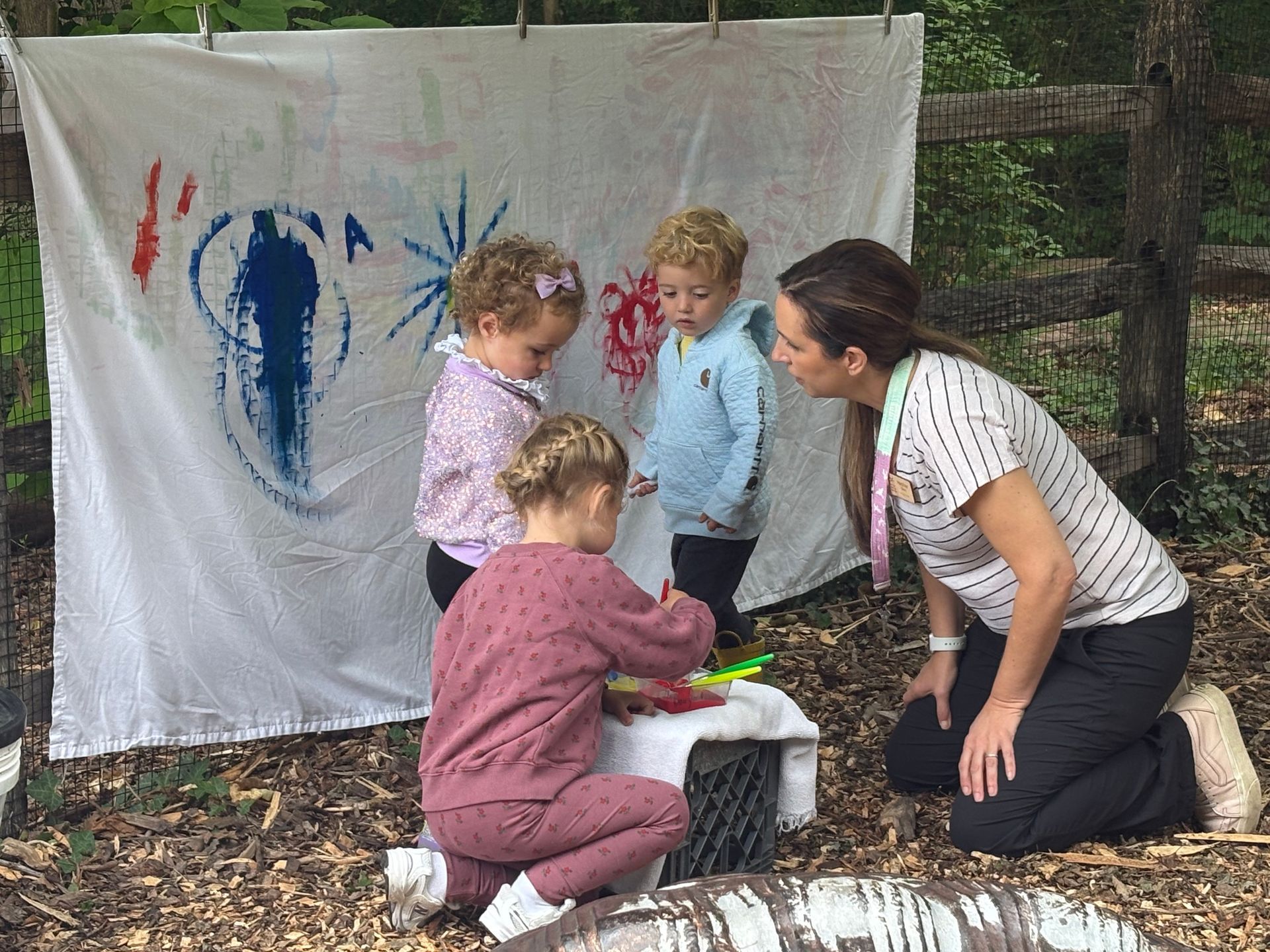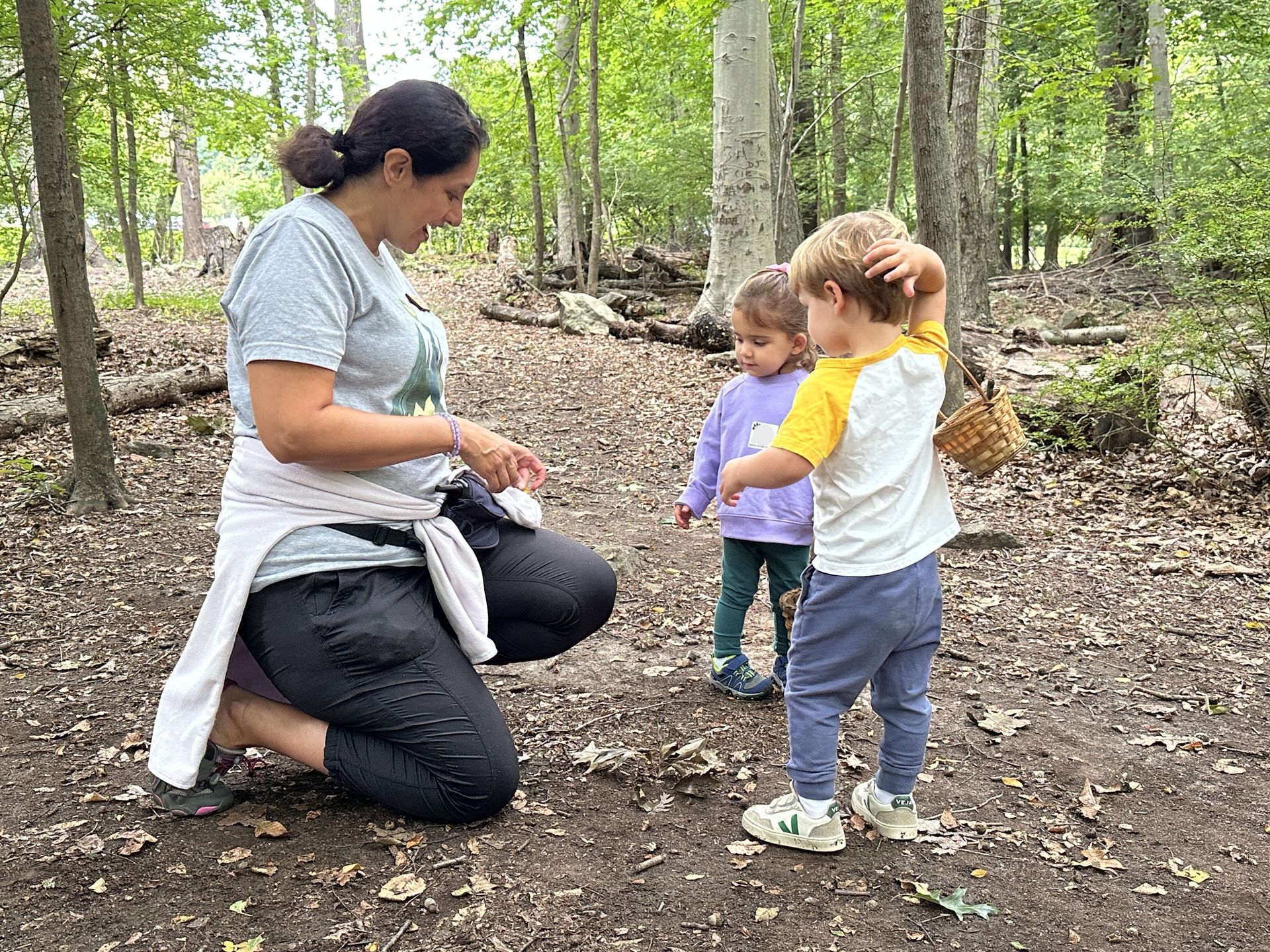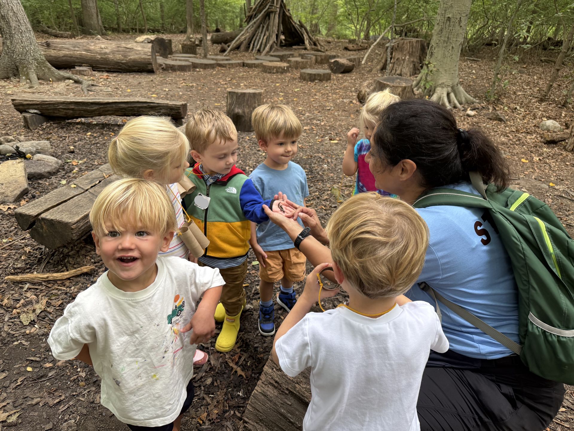 Exploration and discovery are the guiding principles of the Nature Time for Twos program. Children spend their morning engaged in both free play and guided activities that are hands-on and nature-based. On any given day, you might catch students stacking stones, building with small logs, watching birds, searching for bugs, feeling tree bark, or jumping in puddles.
